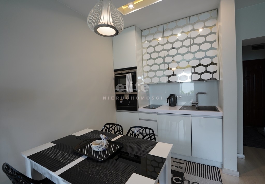 Apartament urządzony w nowoczesnym stylu. W kuchni piekarnik oraz ekspres do kawy firmy Siemens w zabudowie meblowej.