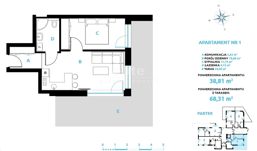 Powierzchnia apartamentu 38,20 m2 z tarasem narożnym o powierzchni 29,50m2.