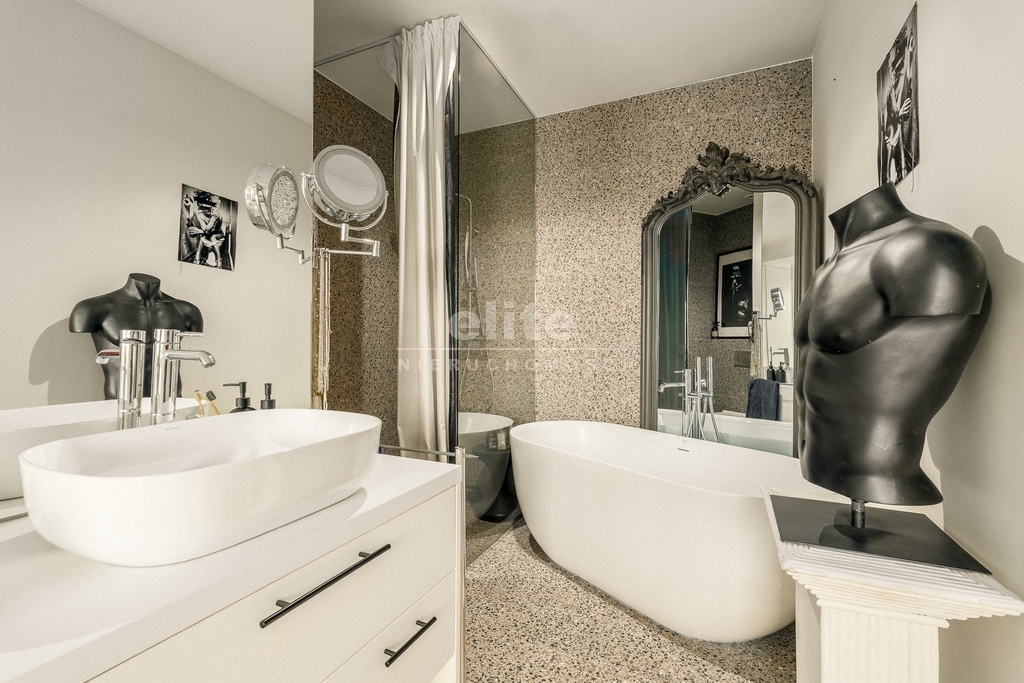 - Design w łazienkach: Stylowe lastryko w formacie 60x120. Do dyspozycji dwie łazienki: na dole z prysznicem, na górze salon kąpielowy z wanną i prysznicem.