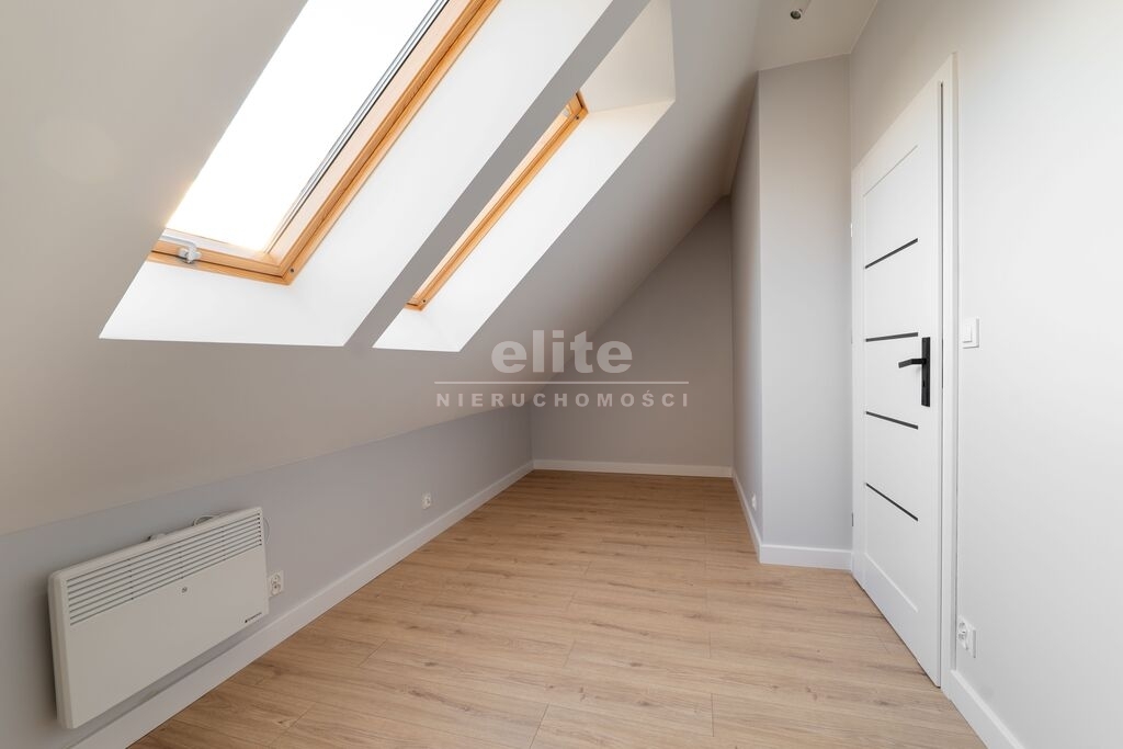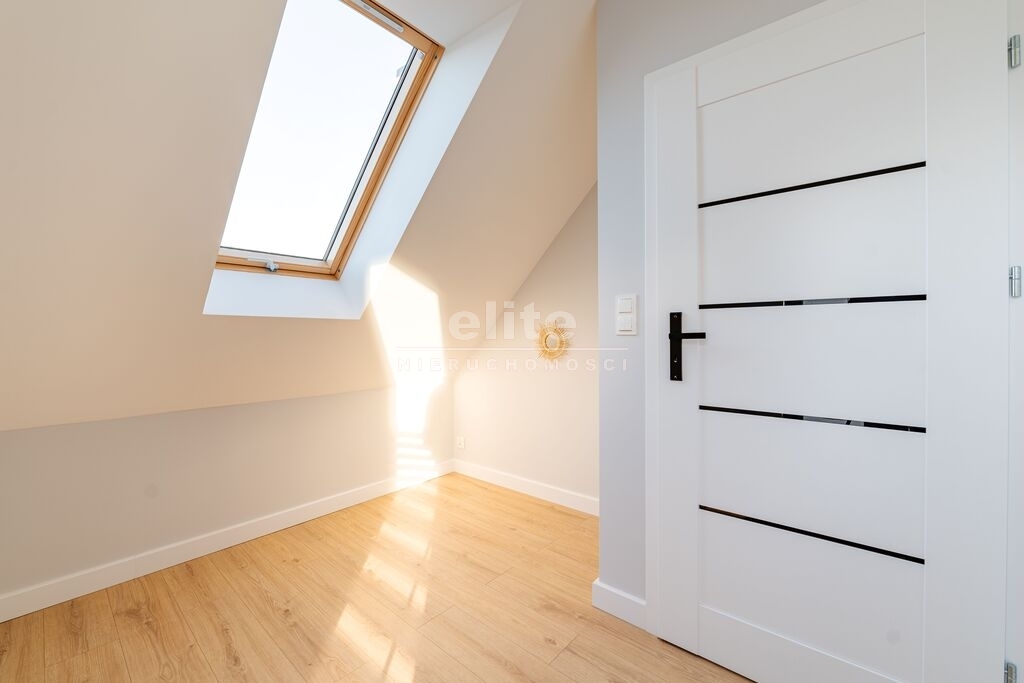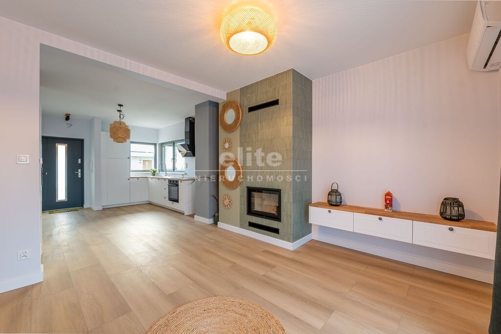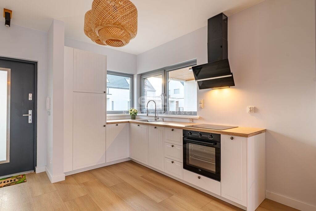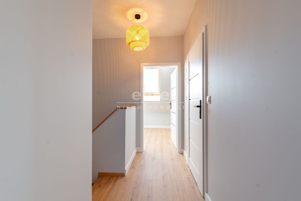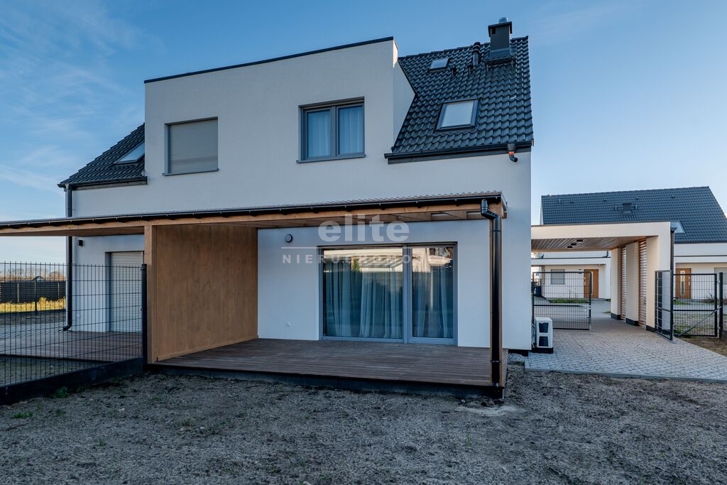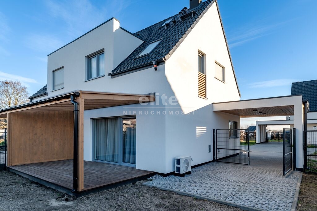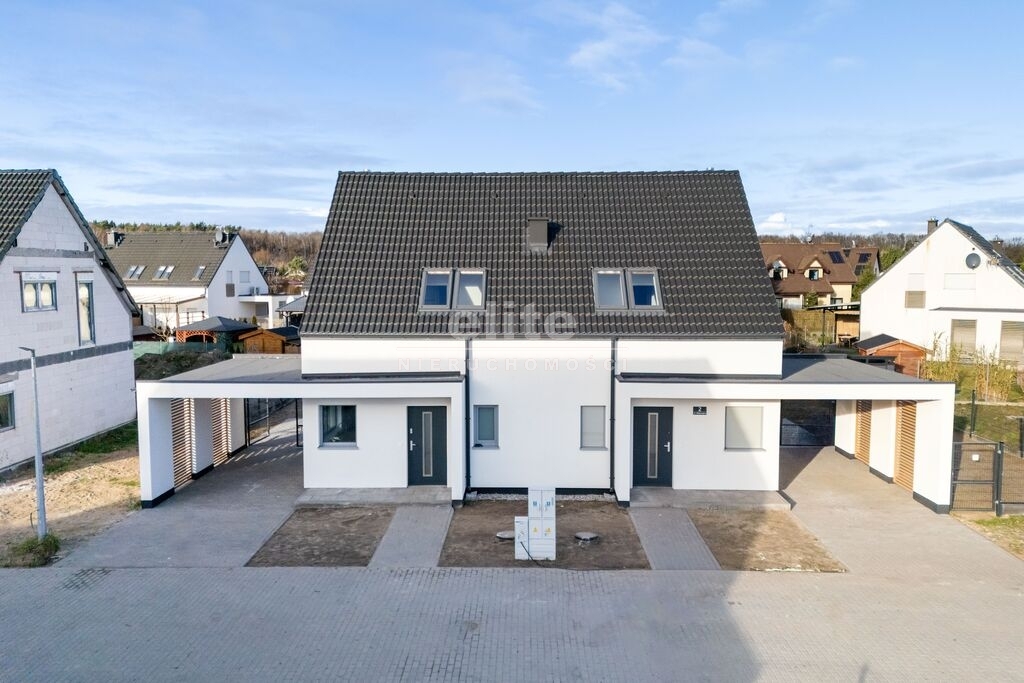 Dom w zabudowie bliźniaczej, usytuowany na własnej działce o powierzchni 300 m² (wydzielona nieruchomość z KW). Powierzchnia całkowita domu to 79,38m2 plus murowana wiata na samochód. Na parterze znajduje się salon z aneksem kuchennym o powierzchni 31,89 m2 z wyjściem na zadaszony taras, wc z kabiną prysznicową (3,12m2), korytarz (3,25m2) oraz powierzchnia pomocnicza (3,02m2). Na piętrze o powierzchni całkowitej 37,63m2 znajdują się 3 pokoje i łazienka z oknem. Dodatkowo poddasze nieużytkowe do zagospodarowania. Duży zagospodarowany ogród.