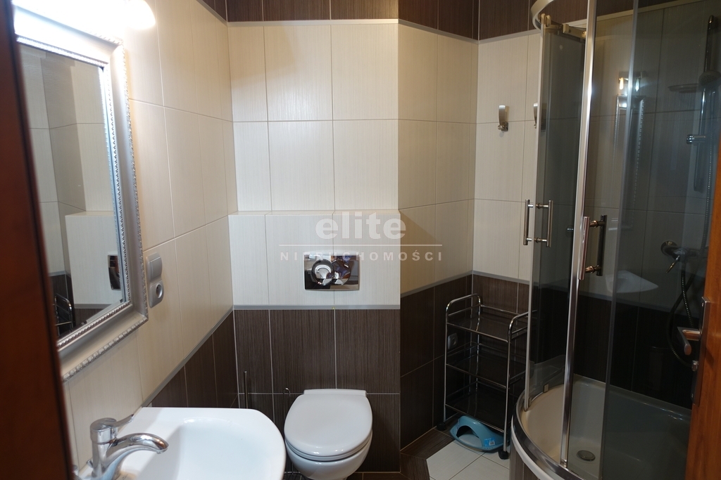 II POZIOM: lekkie skosy, salon z aneksem kuchennym w nim zabudowa meblowa, lodówka, płyta grzewcza elektryczna, lodówka, zlewozmywak, w łazience glazura i terakota, pralka, kabina prysznicowa, umywalka,